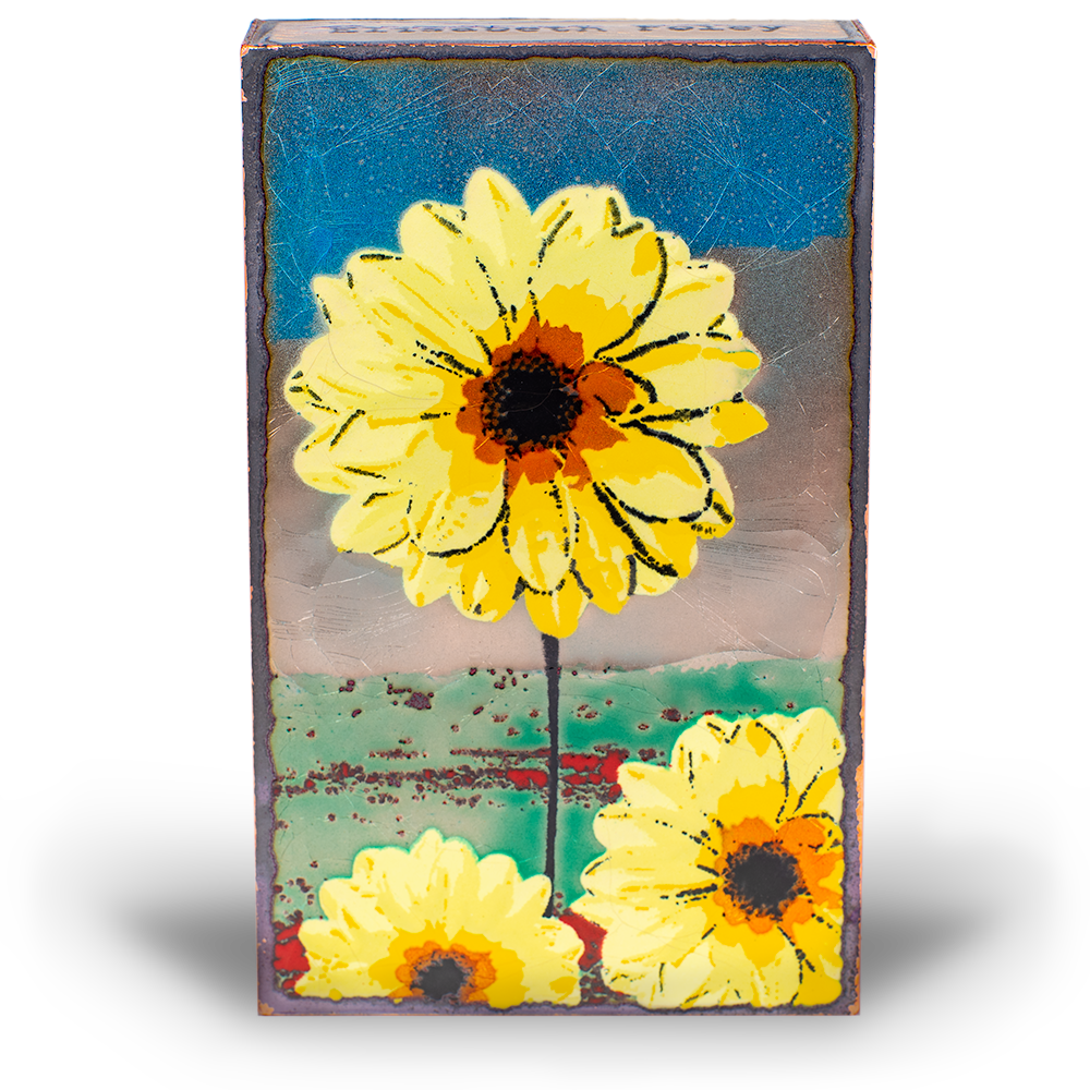 Every Spiritile is handcrafted in Atlanta, Georgia from copper, glass, and wood. Finely ground colored glass is sifted onto copper, then fired by kiln. Before set, the piece is pulled from the kiln and rolled with a heavy metal roller which makes the cracks. This brings light and variety into the piece. Then it is clipped and wrapped around a block of wood for support. "It's like drawing with sand then toasting it on a very hot fire." says Houston.