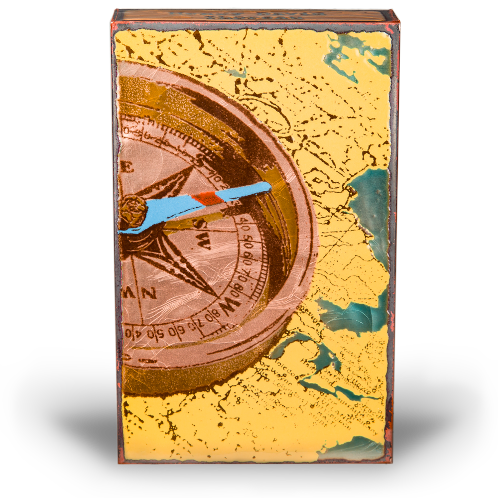 Every Spiritile is handcrafted in Atlanta, Georgia from copper, glass, and wood. Finely ground colored glass is sifted onto copper, then fired by kiln. Before set, the piece is pulled from the kiln and rolled with a heavy metal roller which makes the cracks. This brings light and variety into the piece. Then it is clipped and wrapped around a block of wood for support. "It's like drawing with sand then toasting it on a very hot fire." says Houston.