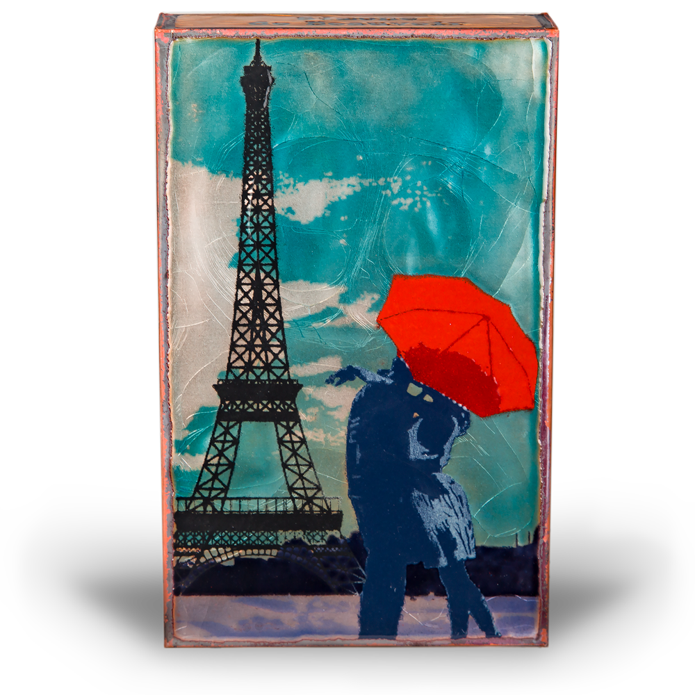 Every Spiritile is handcrafted in Atlanta, Georgia from copper, glass, and wood. Finely ground colored glass is sifted onto copper, then fired by kiln. Before set, the piece is pulled from the kiln and rolled with a heavy metal roller which makes the cracks. This brings light and variety into the piece. Then it is clipped and wrapped around a block of wood for support. "It's like drawing with sand then toasting it on a very hot fire." says Houston.