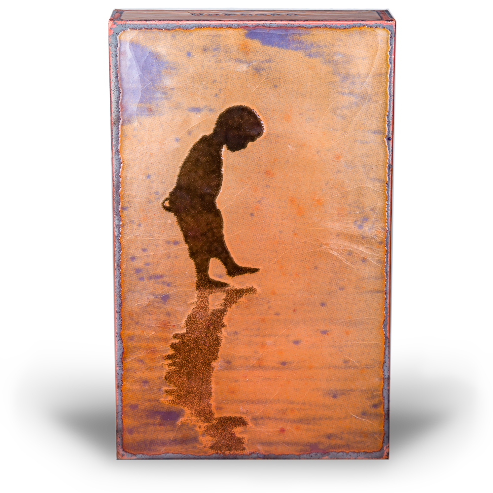 Every Spiritile is handcrafted in Atlanta, Georgia from copper, glass, and wood. Finely ground colored glass is sifted onto copper, then fired by kiln. Before set, the piece is pulled from the kiln and rolled with a heavy metal roller which makes the cracks. This brings light and variety into the piece. Then it is clipped and wrapped around a block of wood for support. "It's like drawing with sand then toasting it on a very hot fire." says Houston.