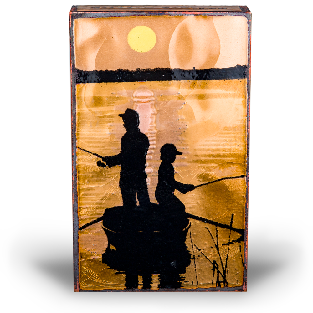 Every Spiritile is handcrafted in Atlanta, Georgia from copper, glass, and wood. Finely ground colored glass is sifted onto copper, then fired by kiln. Before set, the piece is pulled from the kiln and rolled with a heavy metal roller which makes the cracks. This brings light and variety into the piece. Then it is clipped and wrapped around a block of wood for support. "It's like drawing with sand then toasting it on a very hot fire." says Houston.