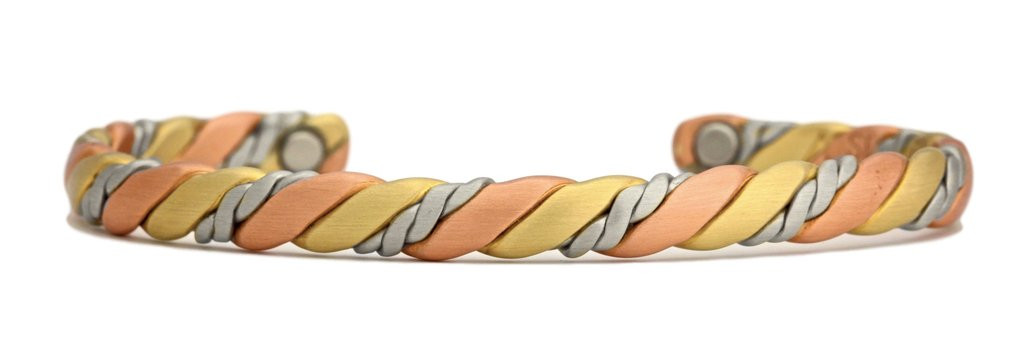 "Sherpa (Brushed)" bracelet by Sergio Lub is hand made in California. This piece is made of brushed copper, silver, and brass.
