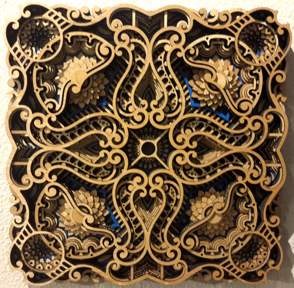 'Zephyr" by Philip Roberts is a 12 Layer wood wall piece measuring approximately 16" x 16". This piece has a hint of blue to enhance the depth of the hills and sweeping curves that weave through the design. This smaller wall piece has a rich visual texture with detailed patterns that beckons for you to take a closer look.